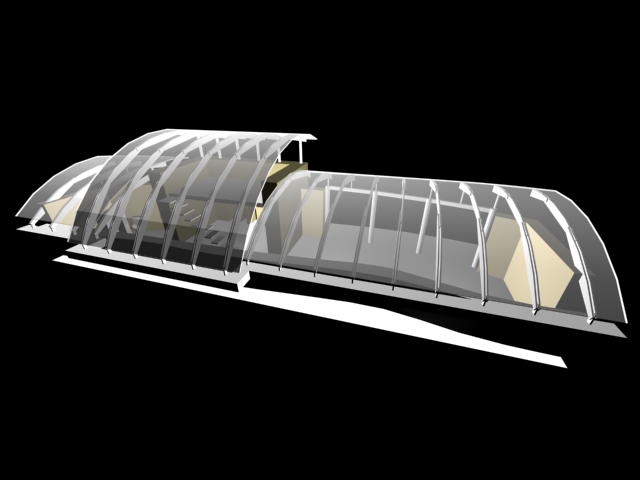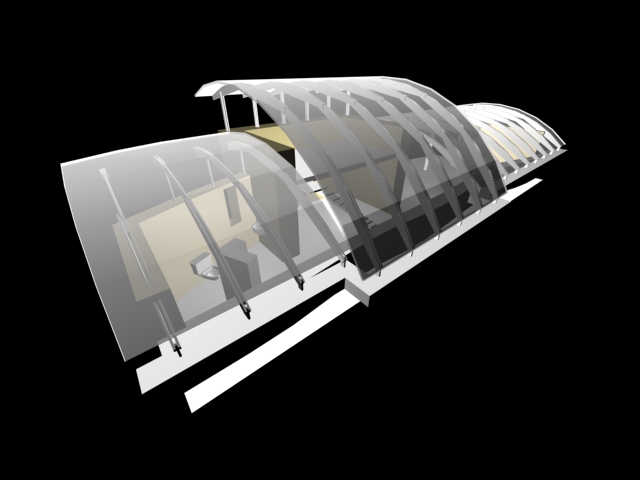 Un único espacio de tres niveles, parcialmente hundido en la topografía del terreno con una cubierta que “flota” sobre los muros, se relaciona en forma simple con el entorno.
