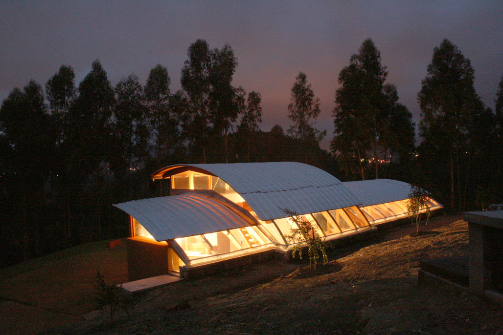 La construcción se compone de un muro de piedra que sirve como respaldo de la cabaña en el terreno (la piedra se obtuvo de una demolición), de muros de adobe mejorado fabricados en sitio, pilares de eucalipto (obtenidos también de una demolición), y una cubierta armada con cerchas de seike unidos con pernos de acero. El revestimiento de la cubierta es de chapa de acero revestida en el interior con espuma de poliuretano, la misma que se monta sobre tablillas de seike.