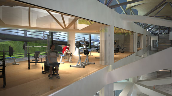c. Espacios interiores: Áreas de experiencia; Áreas de niños; Áreas deportivas húmedas y secas; Áreas de fomento y promoción del deporte, medicina deportiva; Auditorio; Áreas de cafetería y dispendio de refrescos; Área de comercio; Puesto de Auxilio Inmediato.